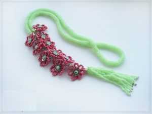 Наденьте на штифт колпачок, а лишнюю часть обрежьте. Остальные элементы загните в петельку. Приделайте сплетенную кисть к оставшемуся кольцу на цепи с цветочками, и можно сказать, что изысканное украшение для шеи полностью готово. Вы можете проявить свою фантазию и сделать своими руками не только такие красные цветочки из бисера, а и другие декоративные элементы, которыми можно дополнить простой жгут или шнур.