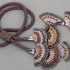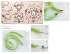 Следующий схематический рисунок продемонстрирует вам, как именно плести лариат. Основой в работе является мозаичный жгут. Согласно схемы плетите шнурок, используя светло-изумрудный бисер, протяженностью пятьдесят сантиметров. Приготовьте штифт с кольцом и пришейте к нему изготовленный лариат. Потом надеваем металлический тюльпан и обрезаем не нужное. Загните своими руками небольшое кольцо. Вторая сторона украшения оформляется аналогично.