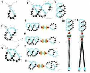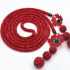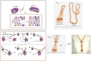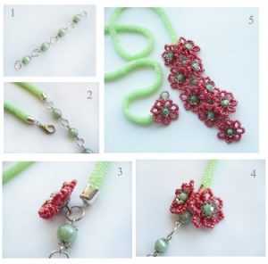 Начинаем крепить цветочки к готовому изделию. Вам необходимо сцепить друг с другом пять колечек и четыре бусинки. Чередуйте их друг с другом так, как показывает рисунок под номером № 1. Вы должны следить за тем, чтобы образованные колечки лежали в одной плоскости. Образовавшуюся цепь необходимо прикрепить к кончику жгута. А на другой край поместите маленький замок. Первый цветок приделайте к кольцу в том месте, где теперь находится замочек. После этого разместите все остальные красные заготовки в количестве девяти штук. На фото можно посмотреть этот подробный процесс по бисероплетению.