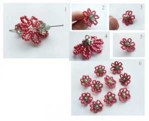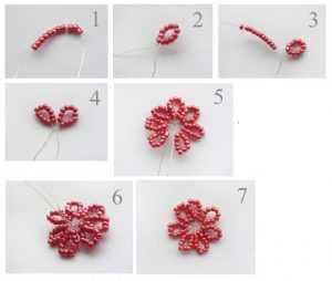 Начинаем мастерить изделие из бисера с мелких цветочков. Каждый экземпляр состоит из 7 лепесточков. Вам необходимо набрать на отрез проволоки одиннадцать бисерин и закрутить петлицу. Тут же сделайте следующую и дальше также. Лишний материал следует отрезать, а кончики соединить и скрутить. В итоге у вас получится первая заготовка.