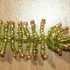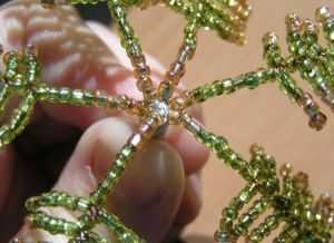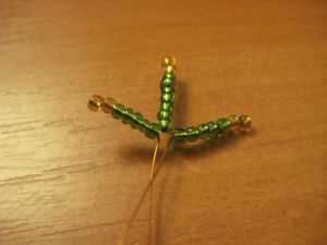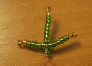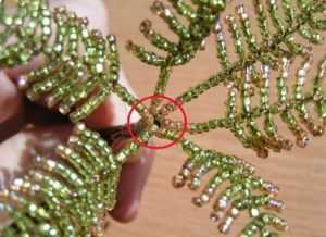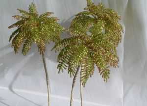 Затем вам следует повторить предыдущие пункты, чтобы сплести необходимое количество иголок для веток пальмы. Скрутите проволочку десять раз, а на сформированную ножку оденьте еще десять стекляшек зеленого цвета.