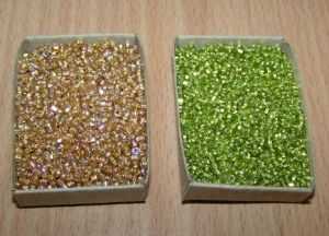 Подготовив перед собой материалы, приступаем к набору семи зеленых и двух коричневых бисерин. Оставьте одну и проденьте край проволоки в обратную сторону сквозь восемь штучек. Это будет верхушкой листа. Аналогичным образом сплетите еще две иголочки с правой стороны и с левой. Для этого возьмите только зеленый бисер в количестве пяти штук.