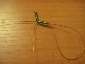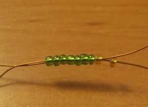 Закрутите основной материал 2 или 3 раза и вденьте одну изумрудную бисерину.