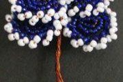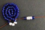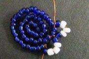 - Нанизать на рабочий конец проволоки четыре элемента: одну синюю бисеринку, три белых и еще одну синюю;