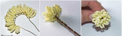 Плести цветок будем начинать с сердцевины желтого цвета. Отмотайте отрез проволоки, который будет длиной пятьдесят сантиметров. Затем наберите тринадцать бисерин желтого оттенка, а потом скрутите петлю, оставив кончик в пять сантиметров. Опять набирайте тринадцать стекляшек и вплотную к первой петле, закрутите и вторую. Всего должно получиться восемнадцать петлиц по тринадцать бусин.