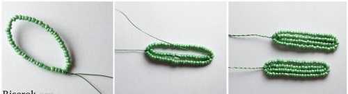 Итак, для плетения листвы понадобится проволочка протяженностью двадцать сантиметров, на которую набирают пятьдесят одну бусину. Замкните заготовку в круг, но так, чтобы один кончик был немного короче другого на пять см. Короткий край проволочки опустите вниз, а на другой наберите зеленый бисер. Затем выполните оборот по кругу листика и опять нанизывайте стекляшки, опустив конструкцию вниз. Края металла скрутите.