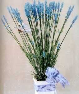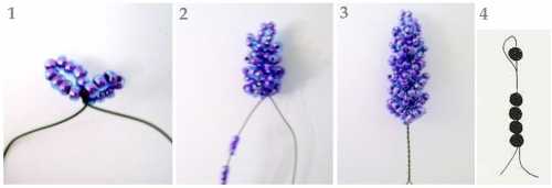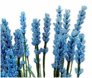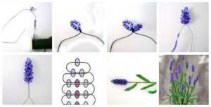 Букет голубой лаванды будет состоять из 40 веток. Начинаем плести одну из них. Нанизываем на отрез проволоки десять бисерин голубого цвета. Далее формируем петлю. Отступите немного места и создайте еще четыре такие петлицы. В одном соцветии будет пять таких элементов. Затем скрутите еще шесть соцветий и можете отрезать провод протяженностью сорок сантиметров. Его следует прикрепить к верхушке первого соцветия и закрутить проволочкой. Потом нужно отступить один сантиметр и прикрутить еще сделанный такой элемент, как было описано ранее.