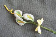 По окончанию формирования лепесточка, его необходимо прошить для создания жесткой формы. Далее необходимо вставить сердцевинку каллы в виде тычинки и прикрепить цветок к толстому проволочному стержню, впоследствии обмотав его флористической лентой зеленого цвета. Флор-ленту можно заменить зелеными нитками, пропитанными клеем, которыми нужно тщательно обмотать ствол.