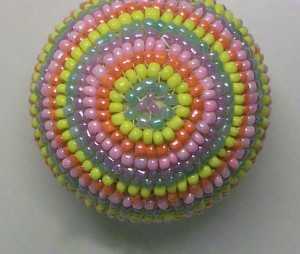 Завершив новую линию, необходимо сделать своими руками прошивку по кругу сквозь все бисерины, для того, чтобы можно было их стянуть. Так мы получим очень плотное оплетение яиц.