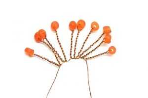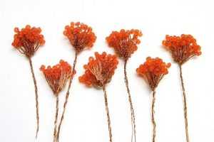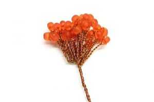 После этого переходим к плетению из бисера гроздьев рябины. Каждая гроздь будет состоять из десяти алых ягод. Обрежьте проволоку, оставив отрезок протяженностью шестьдесят пять сантиметров. Первую стекляшку нужно нанизать на основной материал, отступив десять сантиметров от края. Закрепите бисер и скрутите края проволоки, протяженностью полтора см. Еще один бисер добавьте, только на расстоянии 10 см от той, которая уже была перекручена. Еще раз скрутите проволочку возле основания вновь набранной.
