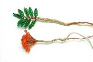 Объедините три грозди и перекрутите возле основания заготовки. Сплетите из бисера семь таких элементов. Когда у вас все готово, можно приступать к основной сборке веток рябины. Начинайте скручивать гроздья и листья воедино. Отступите немного места и еще раз прикрутите второй уже листок.