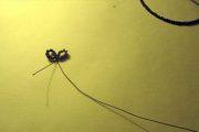 Отделим с низки 7 бисерин и сложим их плотненько к 1 петле. Снова перекручиваем под 2-ой готовой петелькой проволоку на 1 раз. Внимание: 2-ю петлю создаем сразу на хвосте от 1-ой петли. Для этого необходимо просто подогнуть 7 бисеринок к 1-ой готовой петли и крутануть их вокруг хвоста;