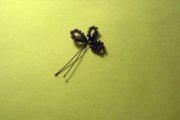 На проволоку нанизываем 11 бисеринок. Затем закручиваем петлю и рядышком и рядышком скручиваем такую же петельку из 10 штук бисеринок сиреневого цвета;