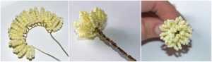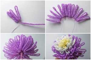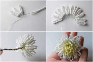 После первого этапа работы, переходим на следующий уровень мастер-класса. Отмотайте проволоку в один метр и сделайте на ней 32 петельки белым бисером. В каждой петлице должно быть 23 бисерины. Затем прикрутите их возле серединки астры. Всю эту получившуюся заготовку нужно скрепить дополнительно основным материалом.