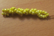 Для изготовления соцветия приготовьте толстый проволочный отрезок, на который необходимо примотать низку из желтого бисера набранного на проволочку меньшего диаметра (рисунки № 9-12). Вы также можете воспользоваться идеей для создания соцветия из предыдущего мастер-класса.