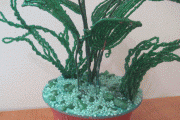 Переходим к созданию, его соцветия-початка. Для этого берем отрезок проволочки длинной в двадцать сантиметров и нанизываем на нее бисеринки желтого цвета. Слаживаем проволочку с бисером пополам и перекручиваем между собой: