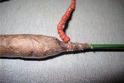Далее, бисерной низкой обматываем нашу заготовку. Не спешите, тщательно, шаг за шагом делайте последовательные плотные витки по всей длине будущего изделия. Кончик проволочки от бисерной низки необходимо укрепить на вершине, как на фото.