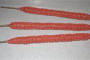 Теперь берем проволочку и нанизываем на нее бисер коричневого цвета, протяженностью около двух метров. Проволочку от катушки лучше не отрезать, таким образом у вас будет возможность добрать бисер, если его буде не хватать.