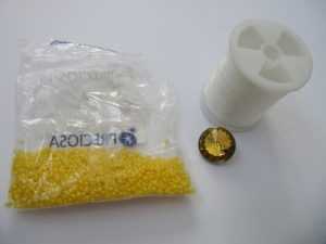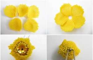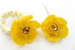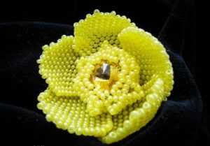 Для плетения другой модели цветка понадобится желтый бисер, декоративный камушек для украшения, и леска с ножничками.