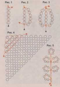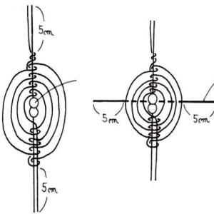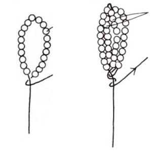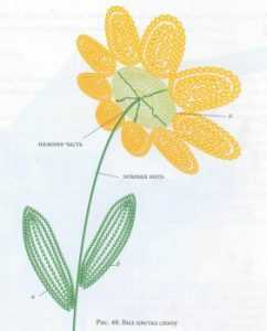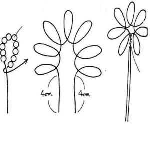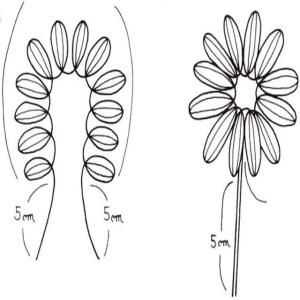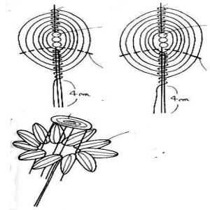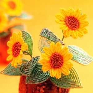 Отрежьте несколько штучек проволоки перед тем, как приступить к бисероплетению. Потом возьмите одну из них и нанизывайте на нее 20 бисерин желтого цвета. После этого скрутите петельку. Точно также необходимо поступить и с другой проволочкой. Образовавшиеся петлицы следует скрестить. Теперь можно сказать, что у вас получился первый лепесток будущего подсолнуха.