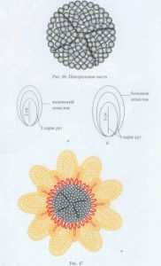 Следующий этап данного мастер-класса заключается в том, чтобы сделать своими руками серединку. Вам нужно скрутить небольшую петлю, набрать 2 элемента, а потом через два сантиметра сделать еще 1 п., только немного по –крупнее. Круглую центральную часть цветка плетите коричневым цветом. Когда вы выполните полные 4 оборота, численность бисера необходимо подбирать по мере надобности. Ни в коем случае не допускайте зазоры между дугами. Когда сердцевина будет готова, необходимо ее прошить горизонтально.