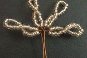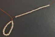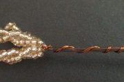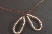 - Теперь задействуем второй, более длинный кончик проволочки и формируем рядом с первой вторую петельку из золотистого бисера;