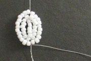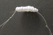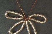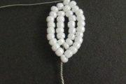 Для создания среднего лепесточка, готовим отрезок проволочки в пятьдесят сантиметров. Далее нанизываем на ось шесть бисерин белого цвета и создаем восемь дуг из четырех витков.