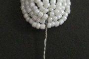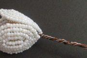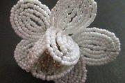 Для изготовления маленького лепестка нужно приготовить отрезок проволоки в сорок пять сантиметров. Далее, набрать на ось пять бисеринок белого цвета сделать восемь дуг в четыре витка. В итоге вы должны получить выпуклый малый лепесток. Сделав два витка, необходимо слегка загнуть кончики проволочки и продолжить формирование следующих двух витков, убавляя бисеринки в каждой из дуг.