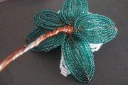 Осталось для бутонов сплести четыре чашелистика. Подготавливаем еще один отрезок проволочки, длиной 0,9 м. Далее на ось, необходимо нанизать четырнадцать бисеринок и сделать двенадцать дуг в шесть витков.