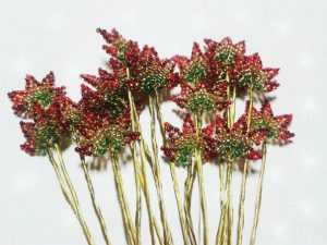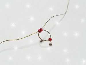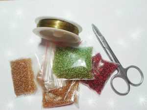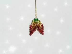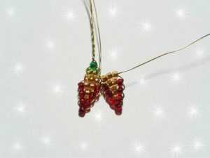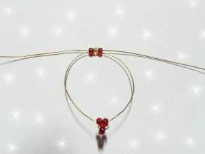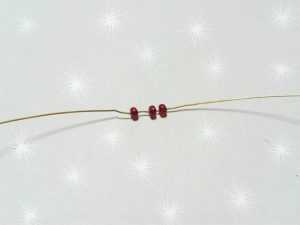 Листья являются главным и фактически единственным предметом в этой поделке из бисера. Чтобы их сплести, нужно использовать разные цвета бисера. Готовая поделка смотрится настолько прекрасно, что дополнять ее чем-то еще не имеет смысла. Давайте же приступим к бисероплетению. Нарежьте проволоку на отрезки протяженностью двадцать пять сантиметров каждый. Их должно быть приблизительно 130 штук. Наберите на один отрез три красных бисера и расположите их в центре. Один край проволоки протяните в последнюю стекляшку с одной стороны, а второй край протяните в противоположную. Затяните края так, чтобы образовался треугольник.