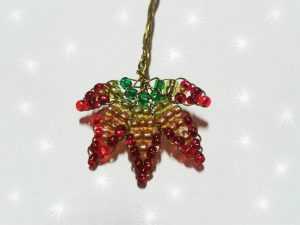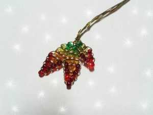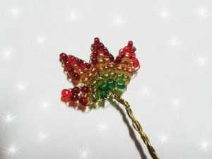 Снова набираем основные элементы по такой схеме: сперва алый бисер, потом оранжевый и опять красный. Второй конец просовываем сквозь три бисерины с противоположной стороны и затягиваем проволочку. Еще раз нанизываем бисер в следующей последовательности: первой идет бусина красного цвета, потом оранжевая, снова оранжевая и красная. Фиксировать заготовку необходимо так, как было описано выше. Продолжайте формировать листву клена, нанизываем три оранжевых цвета. Затем добавьте желтый и в конце зеленый.