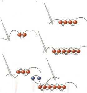 Переходим к новому ряду. Нанизывайте снова 2 бусины, а потом пропускайте иголку под петелькой, которая соединяет два последних элемента первого р. Тяните нитку до того момента, пока новые стекляшки не будут плотно прижаты к первичной полосе, а потом протяните фурнитуру сквозь последний бисер, который был добавлен.