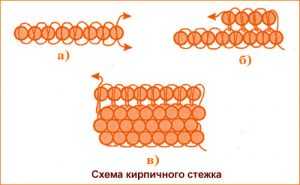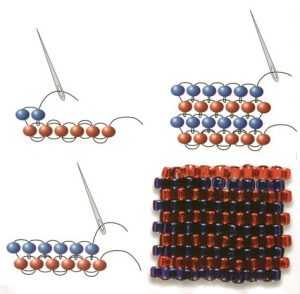 Кирпичное плетение считается одним из самых распространенных в этом рукоделии. Называется оно так, потому что напоминает по своему виду кирпичную кладку. Техника работы похожа на мозаичное плетение, но есть небольшое отличие, которое состоит в том, что в кирпичной технике нитка не проходит сквозь бисерины, а крепится за нити перед этим сформированного ряда.