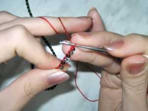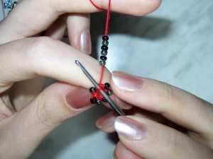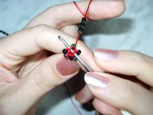 После этого, проводим те же действия со следующей бисериной черного цвета. Нужно ввести крючок в петельку со второй бисеринкой черного оттенка с левой стороны от нее и придвинуть еще одну черную (она будет восьмой). Располагаем ее сверху второй и осуществляем провязывание.