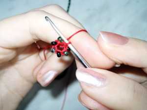 Формируем из данного вязания колечко, вводя крючок в воздушную петельку под номером два без бисеринки. Далее, нитка протягивается в две петли, которые находятся на крючке. Вязание плотно стягивается.