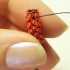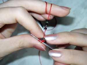 теперь, нужно взять 1 бусинку и придвинуть ее вплотную к петле. Крючок проходит среди последующих бисерин, формируя петлю, а след за эти придвигается бисерина.