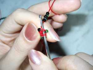 Сделав это, провяжите последующую воздушную петельку с начальной бисеринкой зеленого цвета, как на фото:
