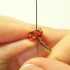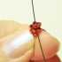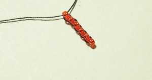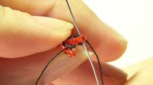 Иголка выводится с бисерину под № 2 от верхушки к низу. Далее, она проходит под нитью, находящейся сверху, которая соединяет бисеринки под шестым и пятым номером.