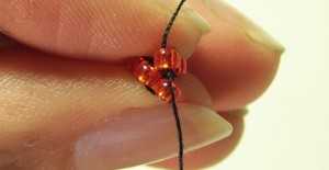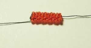 Связав жгут, убедитесь, что вы все сделали правильно. Все ряды, за исключением заключительного содержат бисер с вертикальным расположением (дырочками наверх). Последний ряд состоит бисеринок, расположенных по горизонтали, т.е. отверстия находятся с боковой стороны.