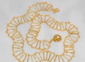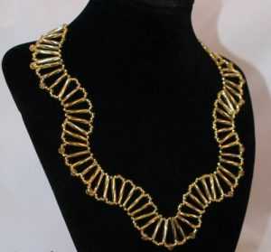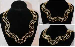 Готовое колье из стекляруса именно такой формы можно носить в разных вариантах. На фото показаны три примера. Украшение меняет свою форму за счет количества завитков и их размещения на шее. Золотистый цвет основных материалов будет блестеть и переливаться не только на солнце, но и на фоне другого освещения.