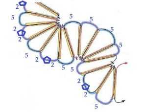 Отрежьте нитку максимальной протяженности и наберите один стеклярус. После этого перенесите его в центр мононитки. Затем на один край наберите бисер, а на второй край уже пять штук. Далее нужно снова взять первоначальный материал и скрестить в нем кончики нитки, и затянуть. Повторите данные манипуляции еще четыре раза, чтобы у вас получилась внутренняя форма веера.