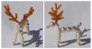 Теперь соединим лески, и нанижем на них две длинные бусины. При этом вы сами можете варьировать их количество, и набирать столько, сколько захотите. Это и есть техника кораллового плетения. Освоив эту технику, даже начинающие смогут легко справиться с изготовлением оленя.