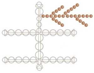 - Продеваем оба конца через одну бисерину крестообразно, с разных сторон (рисунок 1-в).