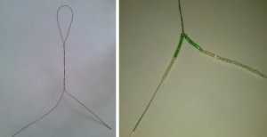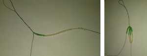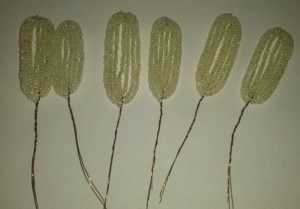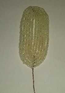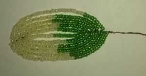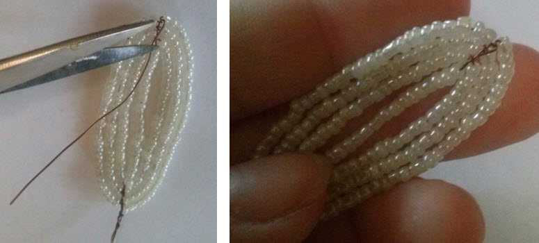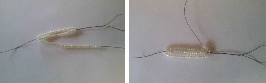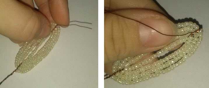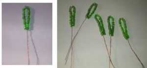 Начинаем новый этап мастер-класса и плетем серединку цветочка. Наберите сорок бисерин на проволочку и выполните петлицу, как показано на представленном фото. Отступайте немного места, приблизительно пять миллиметров и опять делайте петлицу, пока у вас не будет их сплетено десять штук, согласно этого мастер-класса.