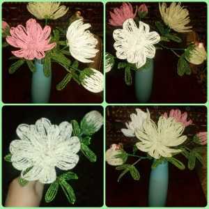 Опять отрезайте проволоку длиной пятьдесят сантиметров и сформируйте петельку. Нанизывайте сначала зеленые стекляшки, а затем розовые. У вас должен получиться лепесток, у которого будут одиннадцать сгибов. Головка изделия состоит из лепестков с семью дугами, сделанными также, как и меньшего размера. Сплетите девять заготовок и объедините их по три штучки.