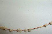 Бисероплетение лучше всего начинать с изготовления цветов. Поэтому сначала мы должны будем отрезать 15 см проволоки и нанизать на этот кусочек 10 белых бисерин. Затем нам нужно будет пропустить 1 ее конец через 5 бисеринок. Аккуратно затянув петельку, мы получим вот такое небольшое колечко. Теперь на это колечко нам нужно будет надеть бусину.