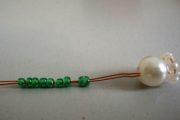 Следом за бусиной мы должны будем нанизать еще 8 зеленых бисерин. Однако здесь есть небольшой нюанс: первая бисерина должны быть чуть больше остальных для того чтобы она смогла перекрыть отверстие в бусинке.