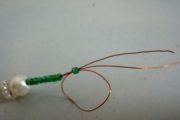 Сначала вы должны будете нанизать бисер зеленого цвета на ось, а затем на тот конец проволоки, которым вы будете плести. Ось может быть сделана как из тонкой, так и из более толстой проволоки.