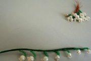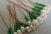 После того как вы закончите плетение бутона вам надо будет нанизать на проволоку примерно 4 зеленые бисеринки и закрепить их. Затем вы должны будете прикрутить такие небольшие веточки с цветами к более толстой проволоке и обмотать ее флористической лентой.