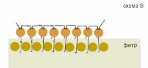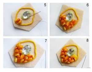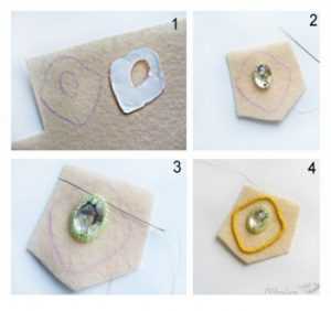 Возьмите перламутр и также пришейте. И хотя он имеет неправильную форму, вы должны нанизывать по три или четыре бусины на нитку, выполняя стежок. С противоположной стороны введите иглу в фетровый отрезок и выведите ее между бусинками, зацепив нитку на которую были набраны эти элементы. После подтяните их к фетру. Таким образом стекляшки будут плотно прилегать друг к другу. Перламутр пришивайте на половину изделия.
